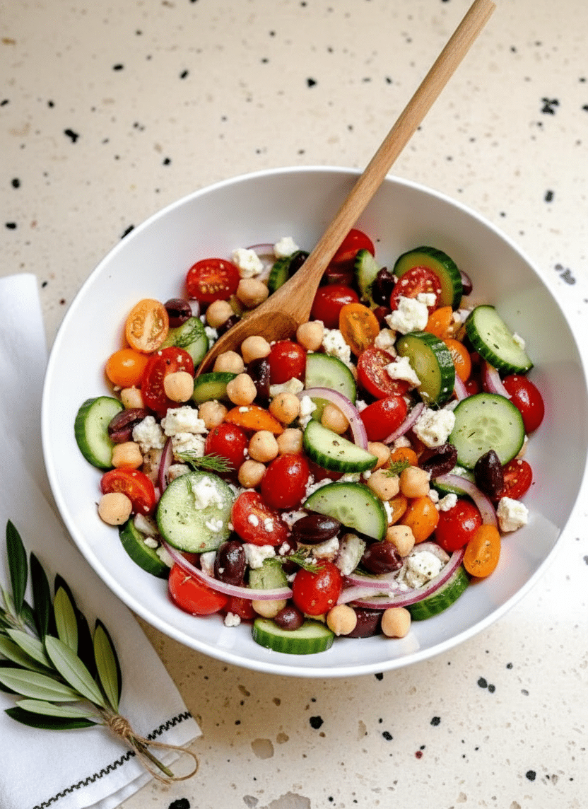This vibrant, protein-packed chickpea salad is a perfect one-bowl meal. Fresh vegetables, tangy feta, and classic Mediterranean flavors make it a healthy and satisfying choice for lunch or dinner.
