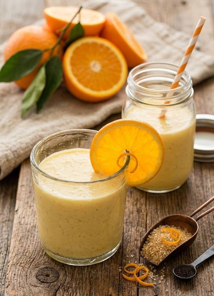By blending fresh orange juice, a peeled orange, a frozen banana, and milk, you get a naturally sweet and creamy smoothie. For those wanting a protein boost, adding a scoop of vanilla or unflavored protein powder turns this into a satisfying breakfast or recovery drink.
