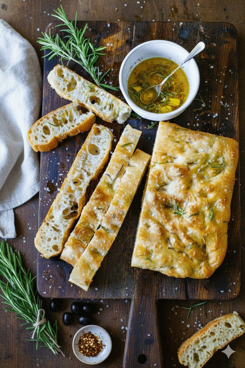 - Serve with dipping oil made from olive oil, garlic, rosemary, and chili flakes.