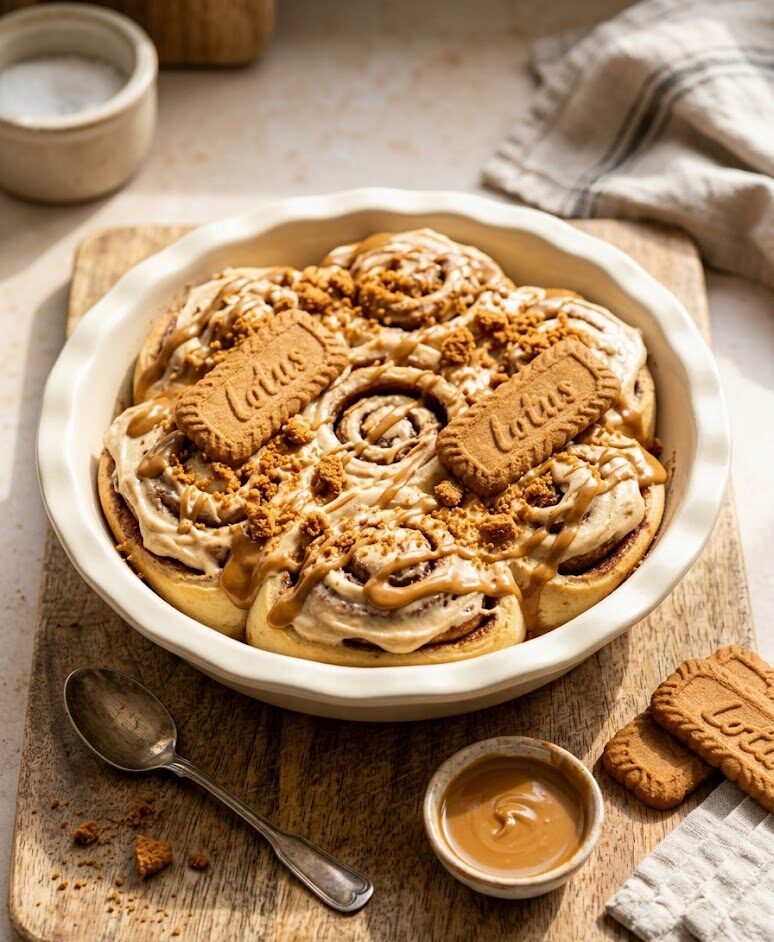 The filling combines brown sugar, butter, cinnamon, and Biscoff spread. As the rolls bake, the mixture melts into the dough and forms sweet, caramelized swirls.