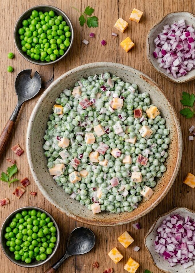 Whether you’re a seasoned cook or just looking for a simple, satisfying side dish, this old-fashioned pea salad delivers on taste, texture, and convenience. The combination of tender peas, sharp cheddar cheese, smoky bacon, and a tangy-sweet dressing creates a balance that’s both comforting and refreshing.