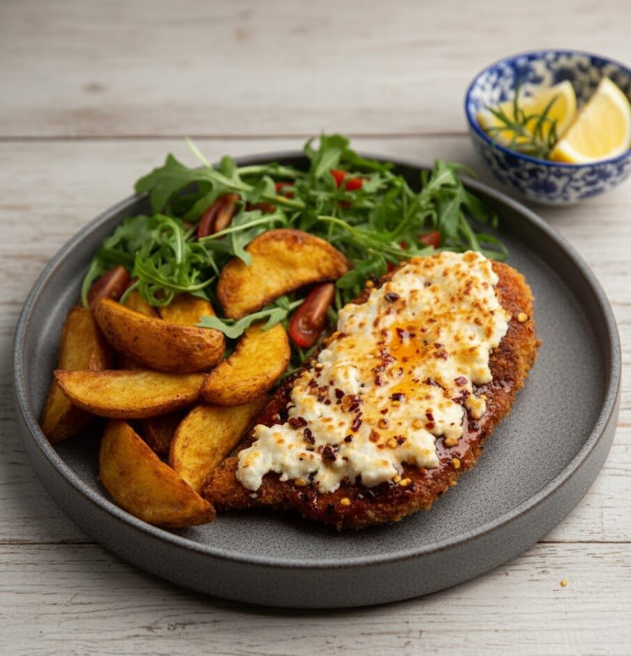Once the chicken is golden, crispy, and topped with melted feta, it’s time to drizzle over the spicy honey. The amount depends on your personal preference, but don’t be shy—this is the flavor bomb moment. Serve with a handful of fresh arugula or rocket for a peppery contrast, and potato wedges, roasted vegetables, or a simple salad to round out the meal.