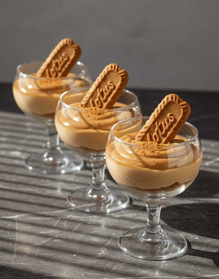 Prepare the crust: Crush the Biscoff cookies into fine crumbs. Mix with melted butter and press 2–3 tablespoons into the bottom of each dessert cup.