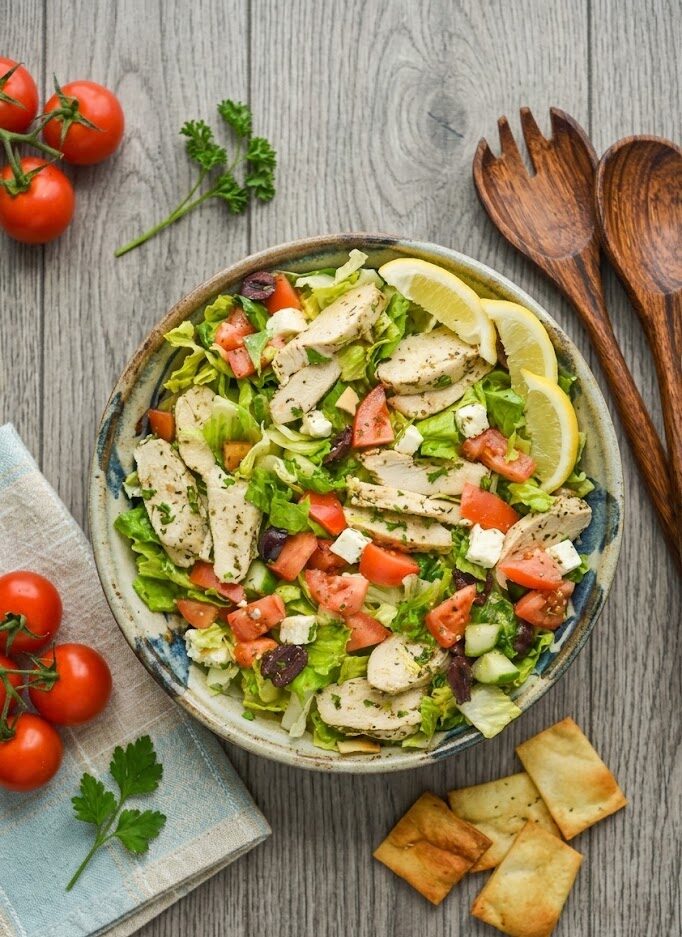 While the chicken cooks, chop the lettuce, tomatoes, cucumber, and feta. Place them in a large bowl. Add Kalamata olives and keep pita chips aside until serving. - Make the Greek Dressing: