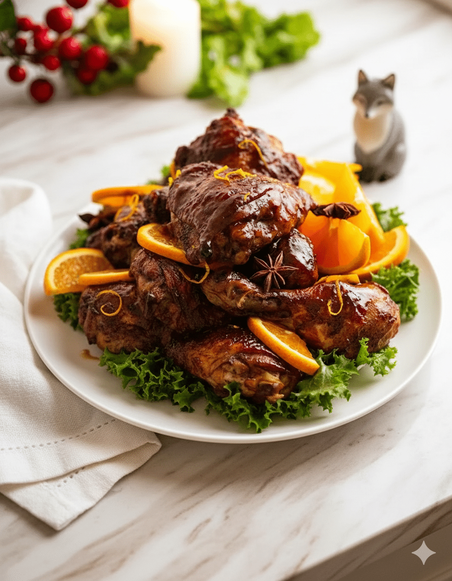 Imagine golden, sticky chicken thighs and drumsticks, caramelized with a sweet, tangy glaze, exuding aromas of cinnamon, star anise, and fresh orange. It’s a dish that not only tastes like Christmas but looks festive on the table, making it perfect for family gatherings or holiday dinners.