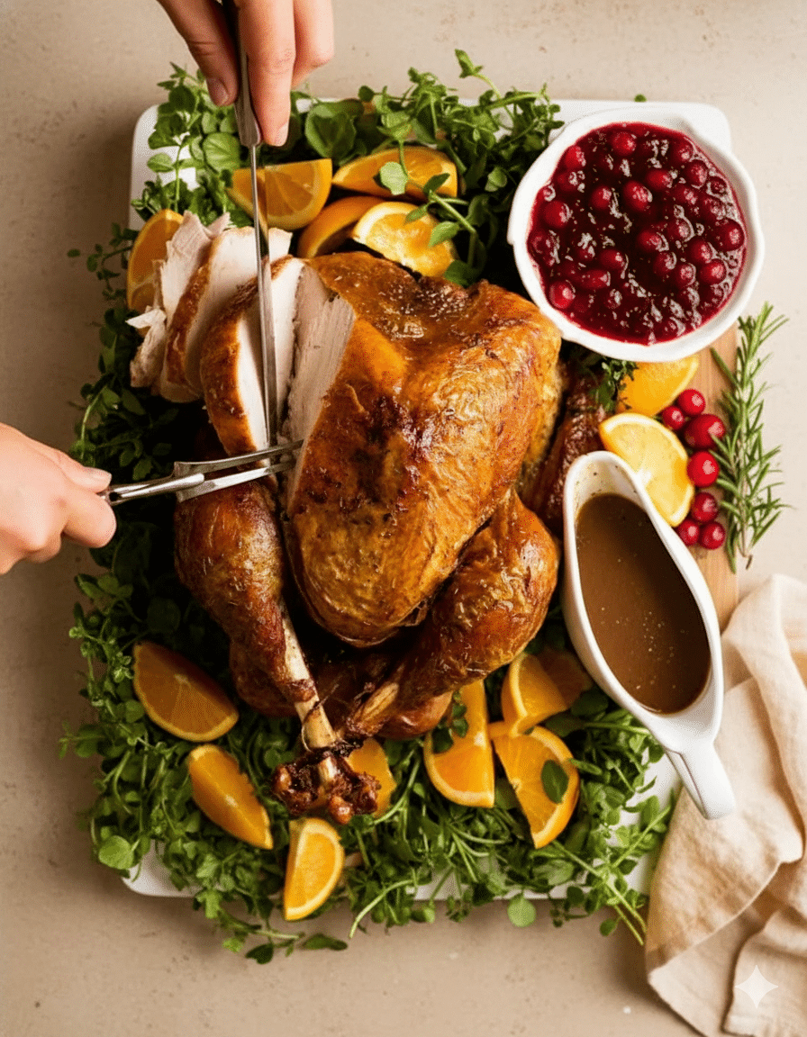 If you’re setting the table for guests, take a minute to make your turkey platter shine. Lay down a bed of fresh greens (like watercress or parsley), tuck in a few orange wedges for color, and scatter cranberries for that festive pop.