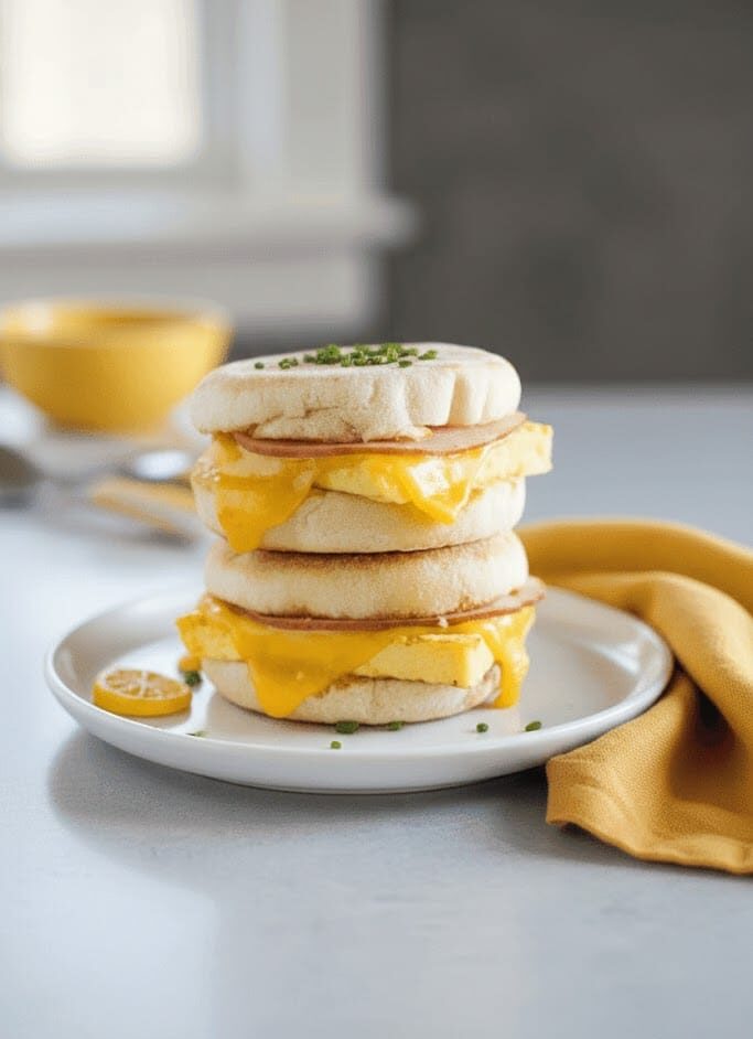 Choosing whole grain English muffins adds fiber and helps keep you full longer. Mixing vegetables like spinach, bell peppers, onions, or mushrooms into the egg mixture adds color, nutrients, and flavor. If you’re watching cholesterol or calories, replacing some whole eggs with egg whites works well. Leaner proteins such as turkey bacon or turkey sausage are also great options, and skipping the meat altogether creates a satisfying vegetarian version.