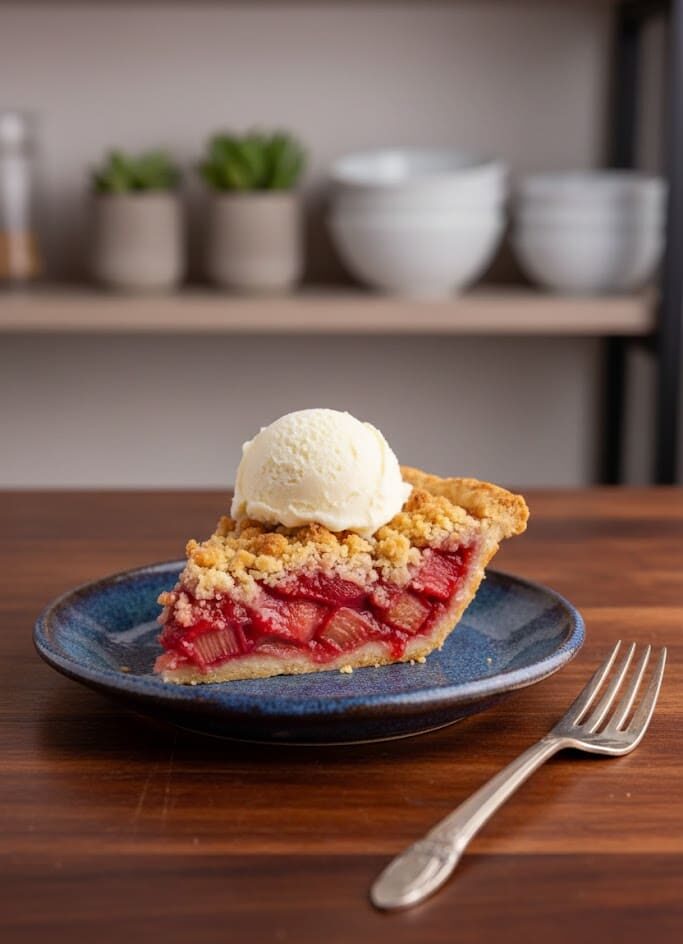 This pie is a delightful dessert on its own but is even better with a scoop of creamy vanilla ice cream. The combination of tart rhubarb, sweet crumble, and rich ice cream is irresistible. Serve it for spring gatherings, weekend brunch, or as a simple family treat.