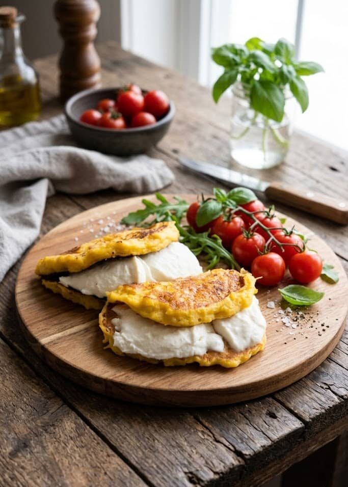 While the pancake is still warm, place slices of buffalo mozzarella on top so it starts to melt. Optionally, add a small pat of butter for extra richness. Serve immediately.